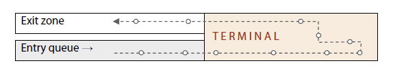 Some terminals are particularly problematic, with queue zones shared between two terminals, and vehicles queuing on an overpass above the terminal operating area. An automated analytical method has to handle all these cases.